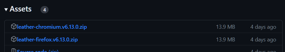 Note: Since November 2023 Leather hasn't been in the Firefox store. The store was serving an outdated version from 2 years ago before that, which made 6.5.1 version of the extension on Firefox the last automatically updated. Manually updating to the latest version, by installing from source is recommended.&#x20;
